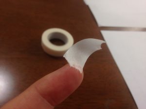 まずテープを3,4cm切ります(手でちぎってOK!)。なおテープは普段お使いのもので構いません。ちなみにわたくしはマツモトキヨシの「紙テープ」を使っております。